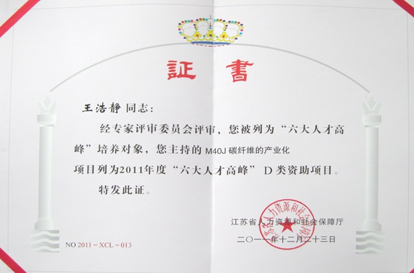 江蘇省“六大人才高峰”證書
