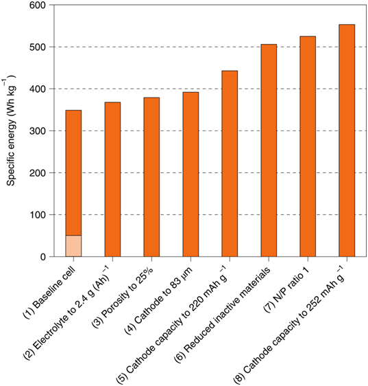 圖1:根據(jù)不同設(shè)計(jì)參數(shù)計(jì)算的電池能量密度。(1)以材料NMC622為基準(zhǔn),其具有196mAh/g比容量(在4.6V截止電壓下),35%正極孔隙率,22.0mg/cm2正極質(zhì)量負(fù)載和70μm正極厚度。N/P比為2.6,電解液容量比為3.0g/(Ah)。基準(zhǔn)電池中的淺陰影區(qū)域表示遠(yuǎn)小于50Wh/kg 能量密度的扣式電池的情況(2)將電解液(電解液與容量比)的量減少到2.4g/(Ah)。(3)將正極孔隙率降低至25%,從而進(jìn)一步將電解液量減少至2.1g/(Ah)。(4)將正極厚度增加到83μm并且將質(zhì)量負(fù)載增加到26.0mg/cm2。(5)將正極容量增加到220mAh/g。(6)減少非活性材料(集流體,包裝)50%以上。(7)將N/P比降低至1。(8)使用容量遠(yuǎn)高于250mAh/g的新正極材料。
