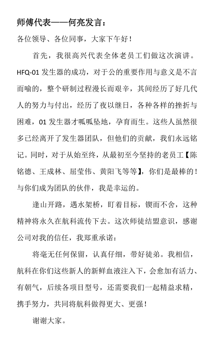 最后公司領導在發(fā)言中指出:公司組織的師徒“結盟”,不只是一種儀式,更是簽字雙方之間的承諾、責任;要求結盟的師徒一定按照崗位和工序的要求,扎實學習,生產出高質量的產品,提升個人,與公司同步發(fā)展,以先進科技和裝備做國防的守護者。