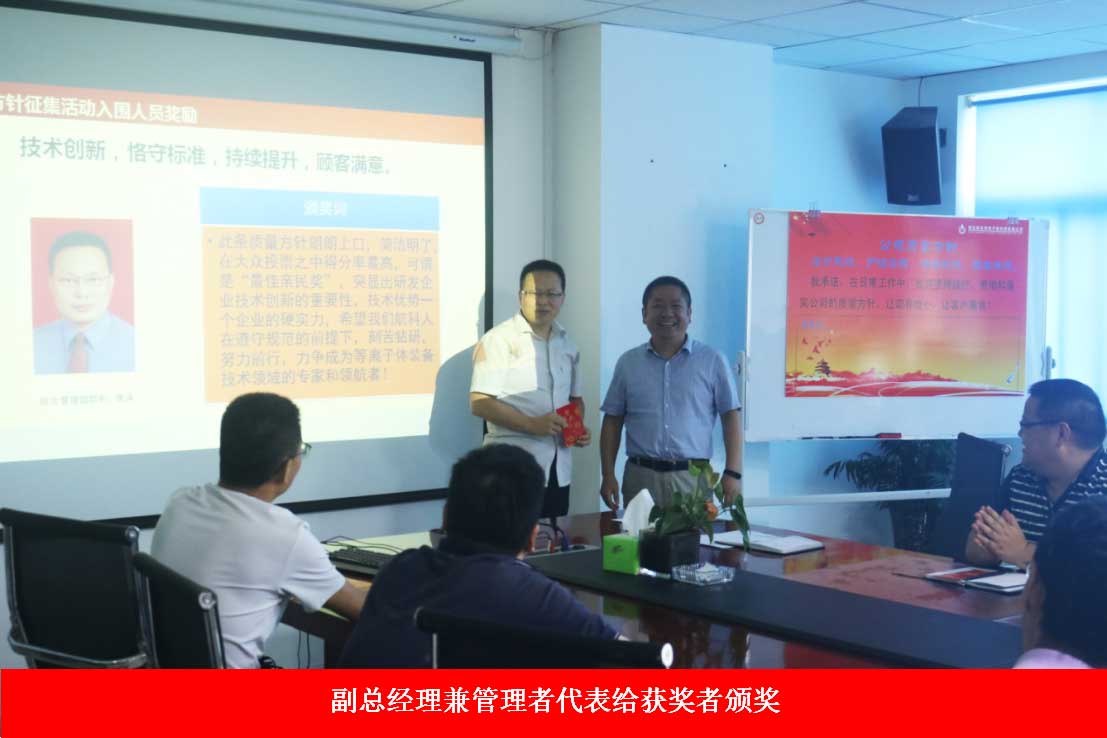 發(fā)布會上,公司對本次質(zhì)量方針征集活動6名入圍人員進(jìn)行了嘉獎,副總經(jīng)理兼管理者代表楊利鋒給獲獎人員進(jìn)行了頒獎,鼓勵全體員工積極參與質(zhì)量管理活動,從自身崗位出發(fā),為質(zhì)量體系的運(yùn)行做出貢獻(xiàn)。