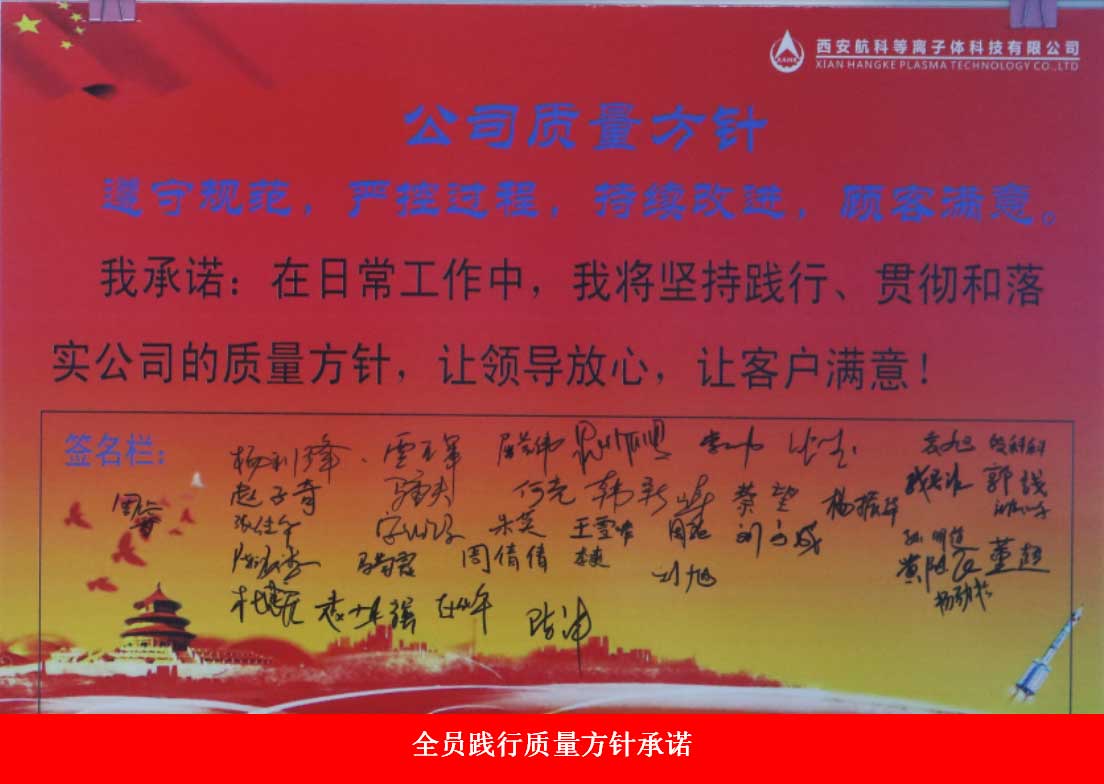 在舒緩的音樂聲中,公司董事長兼總經(jīng)理王浩靜簽署和批準(zhǔn)了公司的質(zhì)量方針,標(biāo)志著質(zhì)量方針正式發(fā)布和實施,意味著西安航科吹響了質(zhì)量管理的號角,公司的質(zhì)量管理邁入了新時代。在副總經(jīng)理兼管理者代表楊利鋒帶領(lǐng)全體員工向董事長兼總經(jīng)理王浩靜承諾:“我承諾,在日常工作中,我將堅持踐行、貫徹和落實公司的質(zhì)量方針,讓領(lǐng)導(dǎo)放心,讓客戶滿意!”,在鏗鏘有力的音樂聲中,全體員工在宣誓板簽下了自己的承諾,表示在日常工作中將嚴(yán)格遵守公司的質(zhì)量方針,為公司質(zhì)量發(fā)展貢獻(xiàn)自己的一份力量。