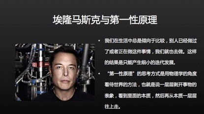 特斯拉的創(chuàng)始人埃隆·馬斯克。馬斯克在很多領(lǐng)域進(jìn)行了非常多顛覆性的創(chuàng)新,所以很多人問過馬斯克,你為什么能夠做這么多的創(chuàng)新?他的解釋是:“我是用第一性原理來思考這些問題的。”