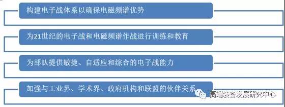 《電子戰(zhàn)戰(zhàn)略》指出,美國電子戰(zhàn)的發(fā)展愿景是通過敏捷、自適應(yīng)和綜合的電子戰(zhàn),在各種軍事行動中進(jìn)攻性地奪取電磁頻譜優(yōu)勢,發(fā)展目標(biāo)包括:
